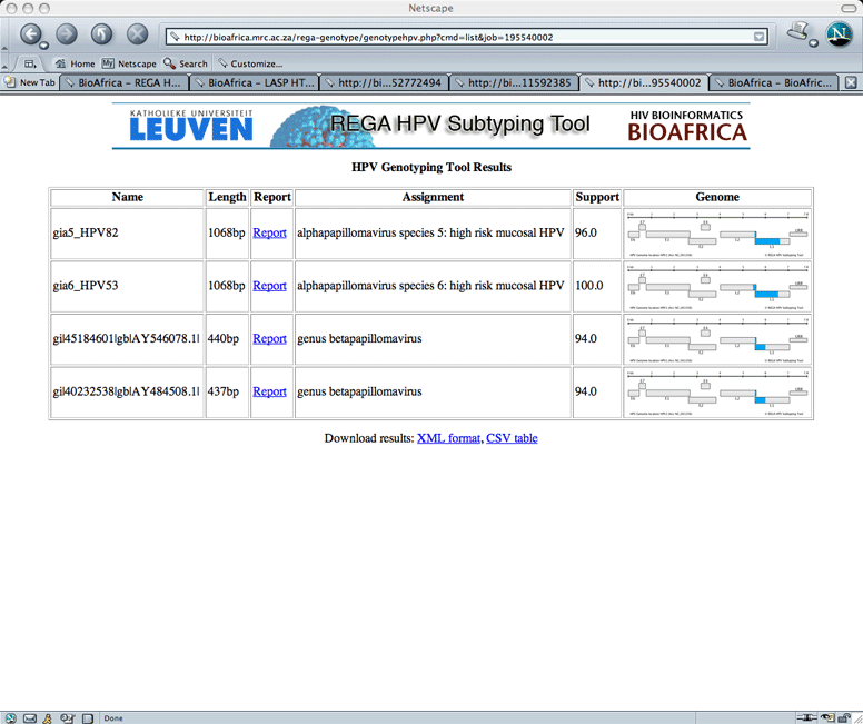 The batch report (figure1) will be the batch report and contain information on the sequence name, length, assigned subtype and a figure of the HPV genome. Accessing the report link will take the user to a report to each submitted sequence.